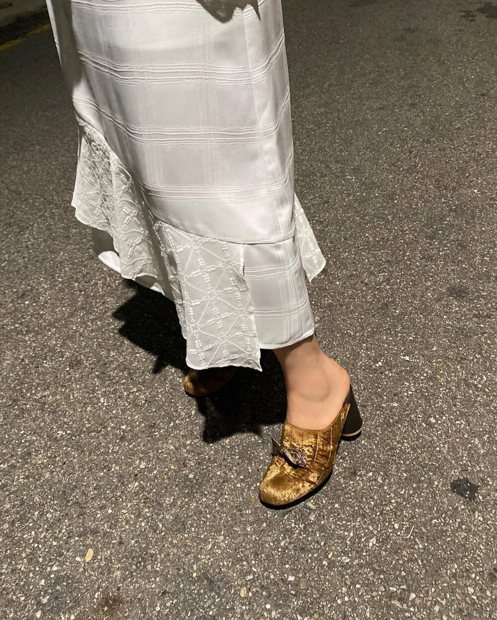 PLEIADES signature mules with an original shape, quilted uppers and hand-dyed silk ribbons.